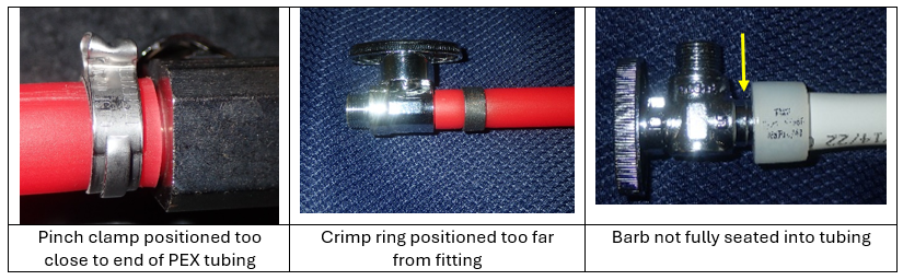 - The ring or sleeve is not centrally positioned over the barb and/or the barb is not fully seated in the PEX tubing. These issues result in poor engagement between the ring/sleeve, PEX tubing, and barb.