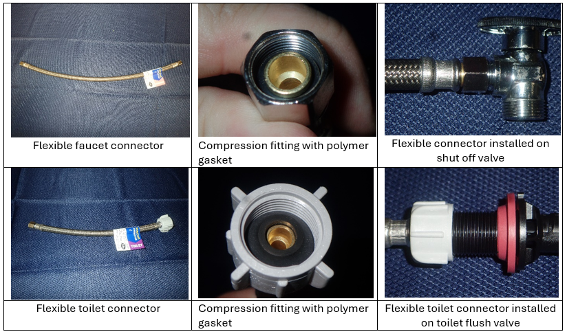 Preassembled flexible connectors are commonly used to connect faucets and toilets to a nearby shutoff valve. They are manufactured by crimping a fitting on each end of a flexible tube, typically ethylene propylene diene monomer (EPDM). The tubing is commonly sheathed with a high tensile strength material, such as nylon or stainless steel, to prevent bursting while under pressure. The fittings typically have captured nuts and polymer gaskets.