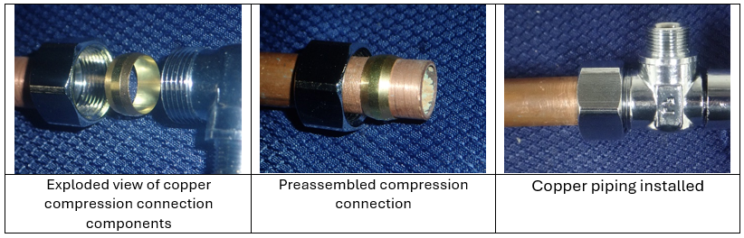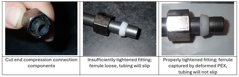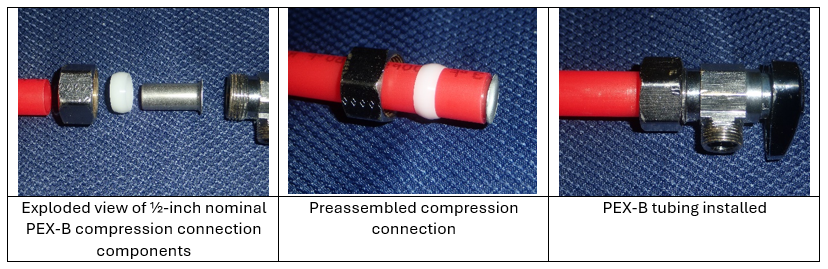 Further, some installers elect to cut the preassembled lines to a specific length to provide a cleaner fit for the installation. This requires assembly of a compression fitting, which can result in the installation errors previously noted. Failures have resulted when installers incorrectly perform the same tightening procedure as for polyethylene tubing, assuming both materials are the same plastic. However, PEX tubing is significantly stiffer than polyethylene tubing, and the fitting must be tightened according to the manufacturer’s instructions to provide sufficient compression.
