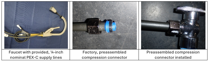 To further speed up installations, some faucet manufacturers have begun producing faucets with preassembled connector lines, typically constructed of ¼-inch nominal PEX-C. The connectors are of sufficient length to fit a variety of installations. Because the materials differ from the typical preassembled flexible faucet connectors, manufacturers specify that the fitting be tightened significantly more than the typical flexible connector, typically two full turns past hand-tight. Some installers fail to review the manufacturer’s instructions for this unique application.
